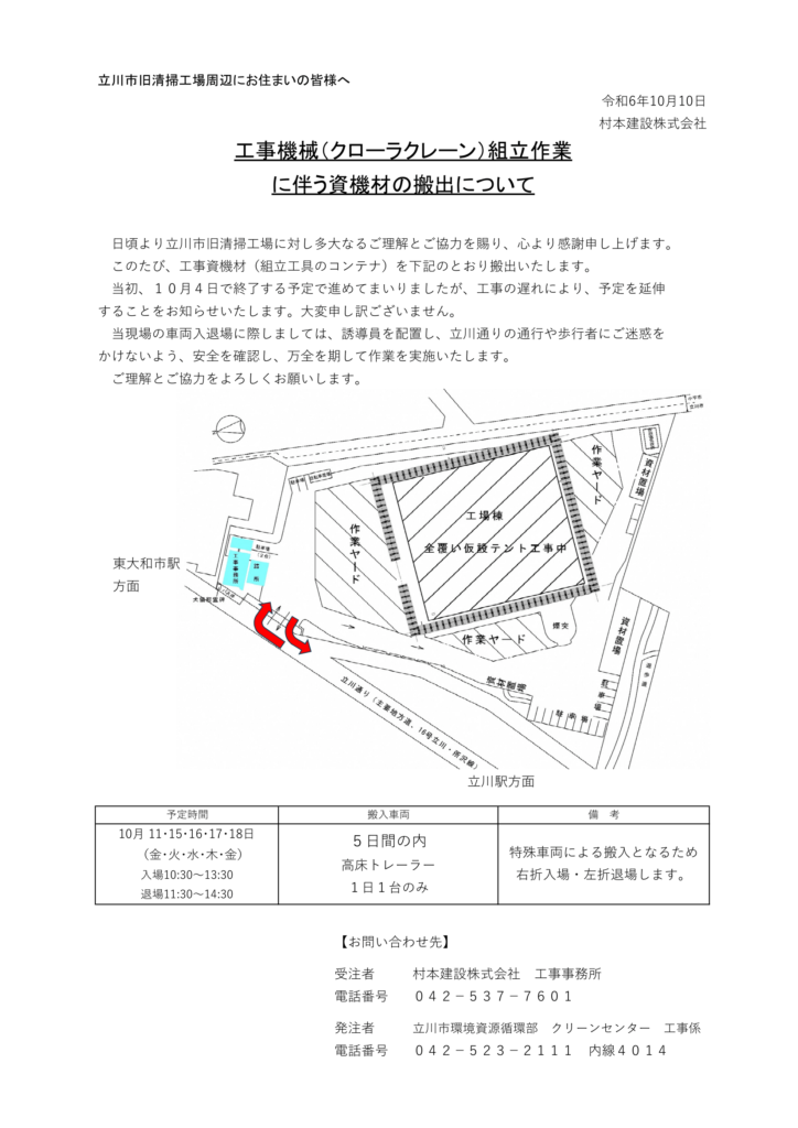 工事機械(クローラクレーン)組立作業に伴う資機材の搬出について