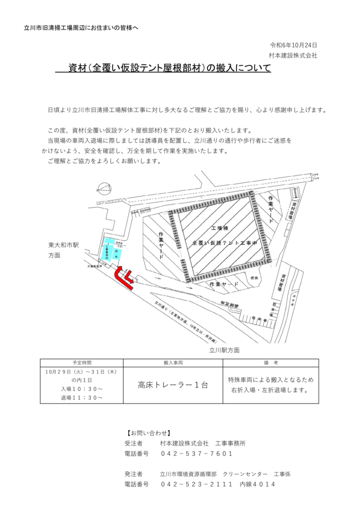 資材(全覆い仮設テント部材)の搬入について