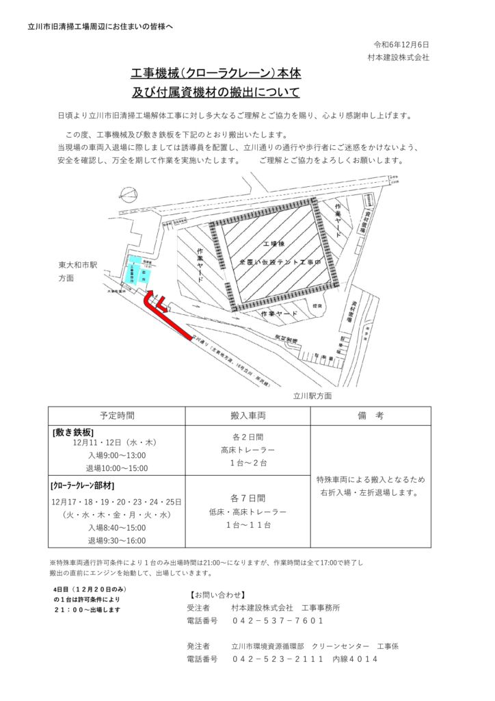 工事機械(クローラクレーン)本体及び付属資機材の搬出について