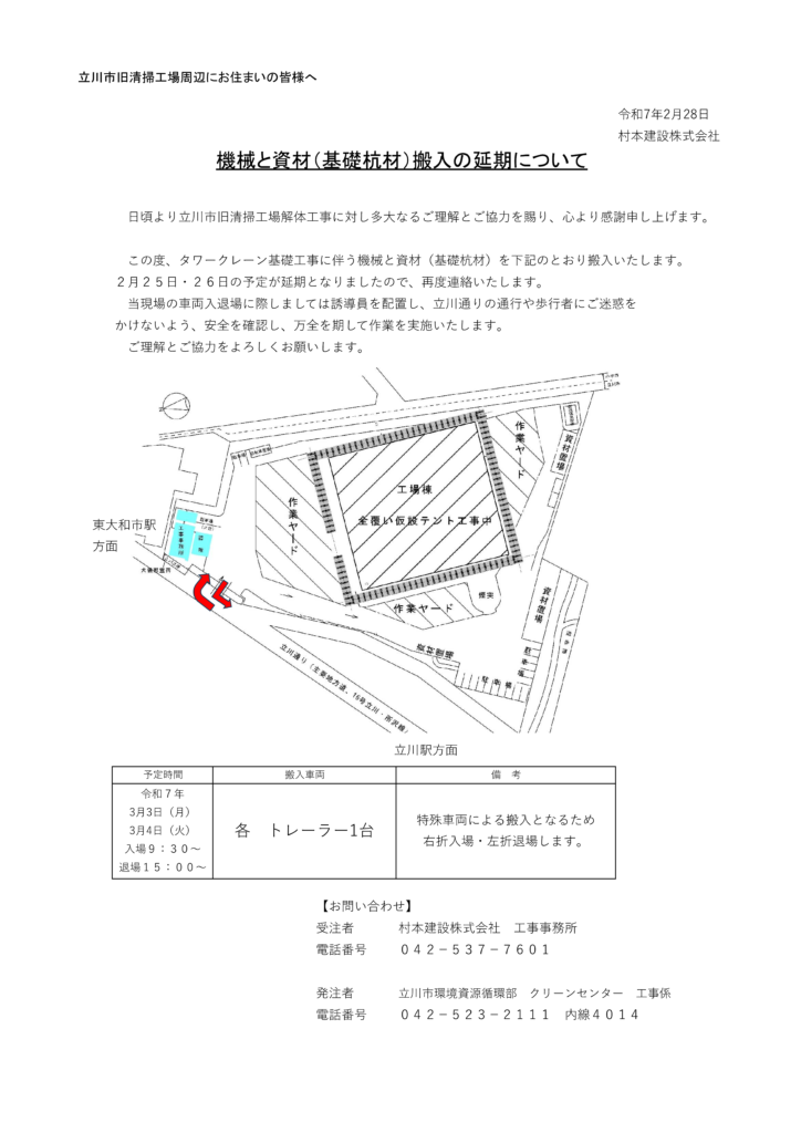 機械と資材(基礎杭材)搬入の延期について