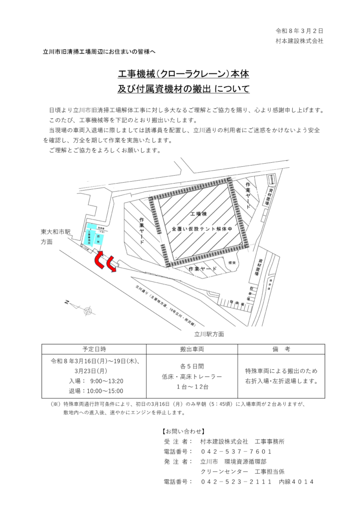 工事機械(クローラクレーン)本体及び付属資機材の搬出について